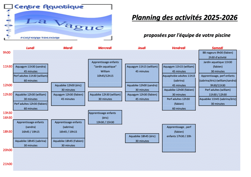 Horaires et planning des activités proposées par vos Maîtres nageurs :